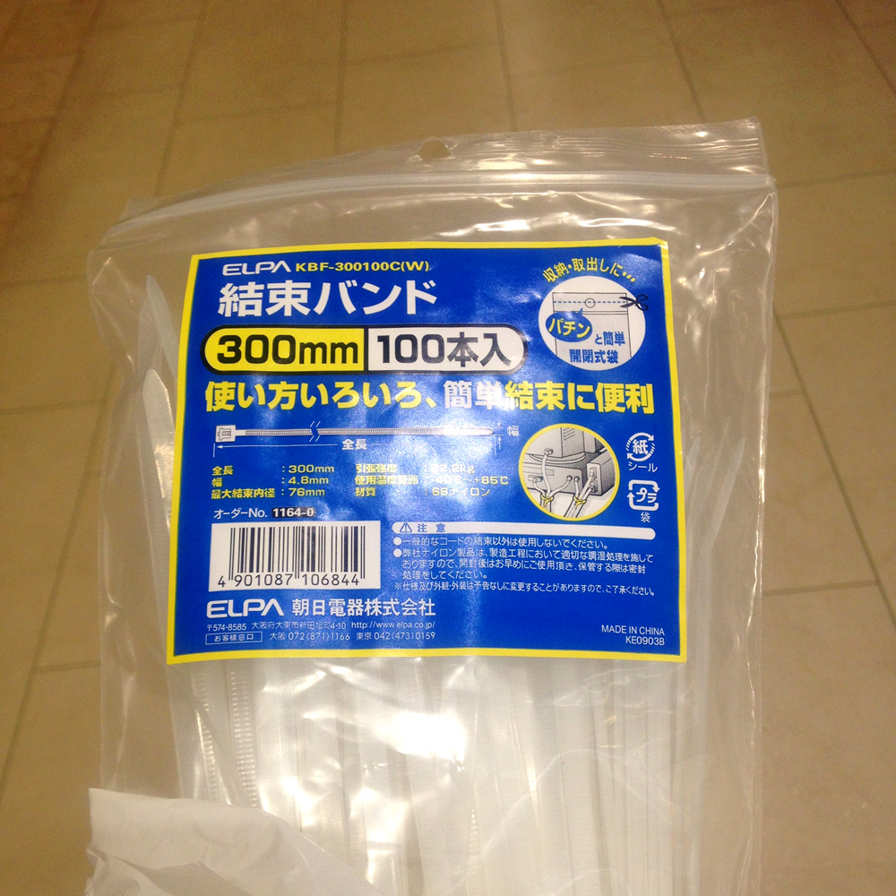 なんか普段買ってるインシュロックとは違う高級なモノに見えます。サイズは200mmとかもあったけど、もしも短いと残念な気分になるのと、幅がやっぱ太いほうが丈夫だろってことで300mmをチョイス。