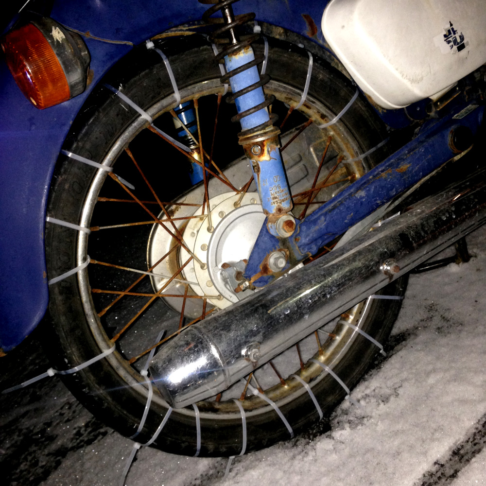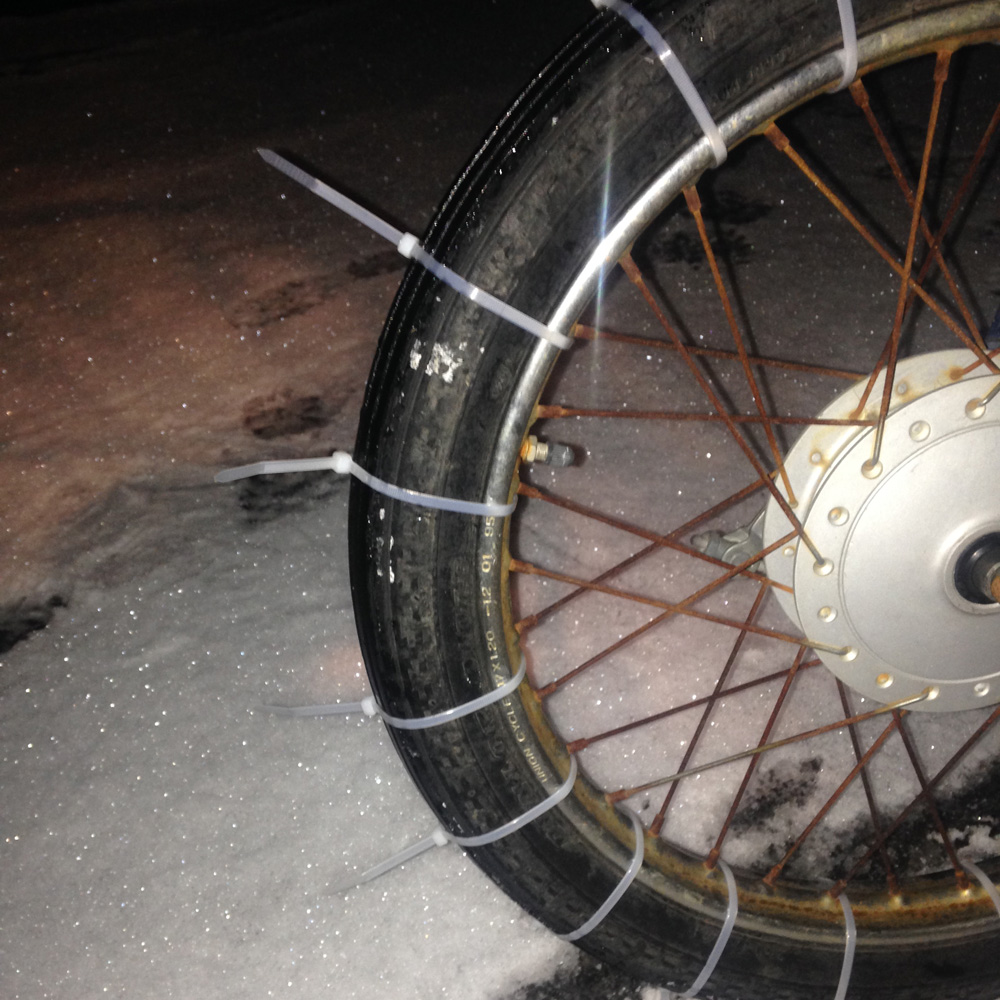 良く、結束バンド(インシュロックとかタイラップ)をタイヤに巻きまくってチェーンにすると良いだの良くないだの聞くのを思い出し、でも否定的な意見が多いというか実際やってみた人の話を聞かないのでやってみようと。