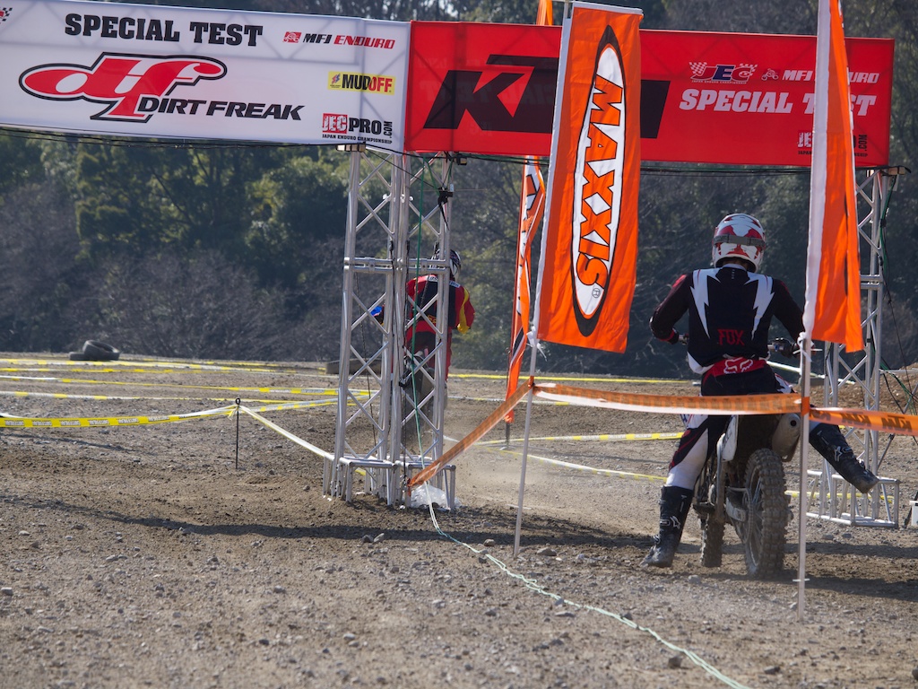 『スタートのアーチをくぐりコースを一周してゴールのアーチをくぐり(写真1、KTMのバナーが貼ってあるアーチがスタート、DFのバナーが貼ってあるアーチがゴール)パドックを徐行して再度またスタート地点に向かいスタートする。ただし自分の持ち時間2時間の規定時間内に11周(Aクラス)すればいいので自分で時間の調節をしながら一周回ごとに自分のパドックに戻りバイクを整備するなり休息をとるなりすぐにまたコースに向かうなり自由。』